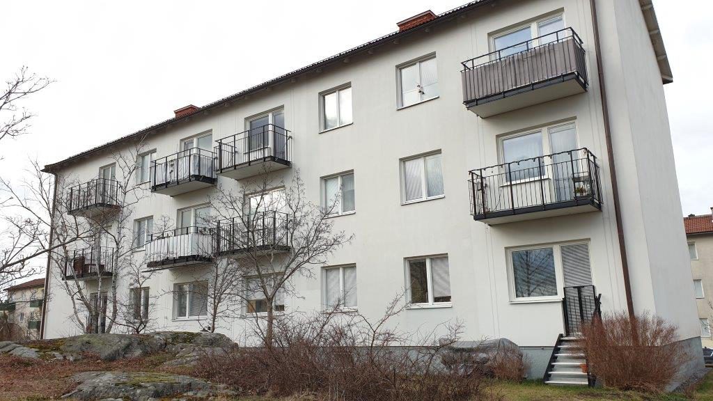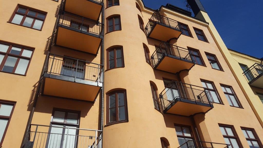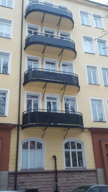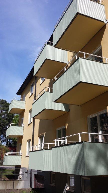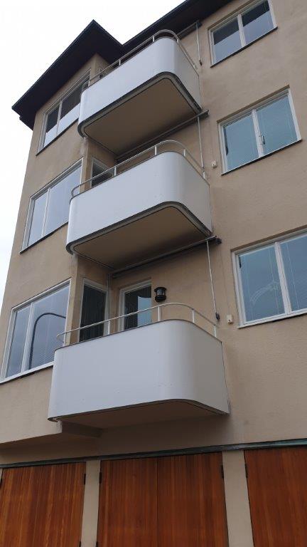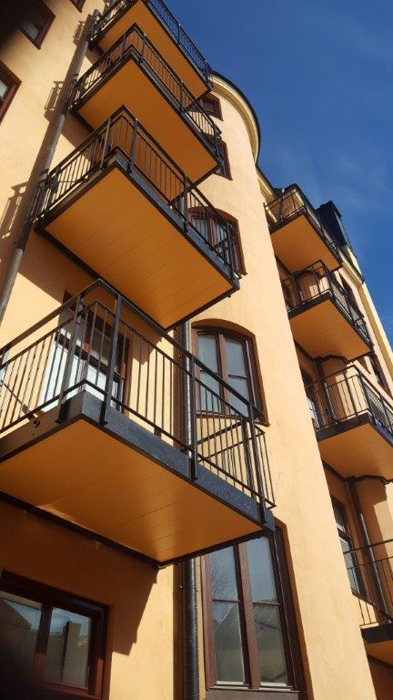 Balkongrenovering: Hel nerbilning av balkonger, omgjutning av balkonger samt nya räcken i aluminium.