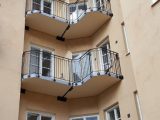 Stålbalkong.Tillbyggnad av stålbalkonger med smidesräcken .